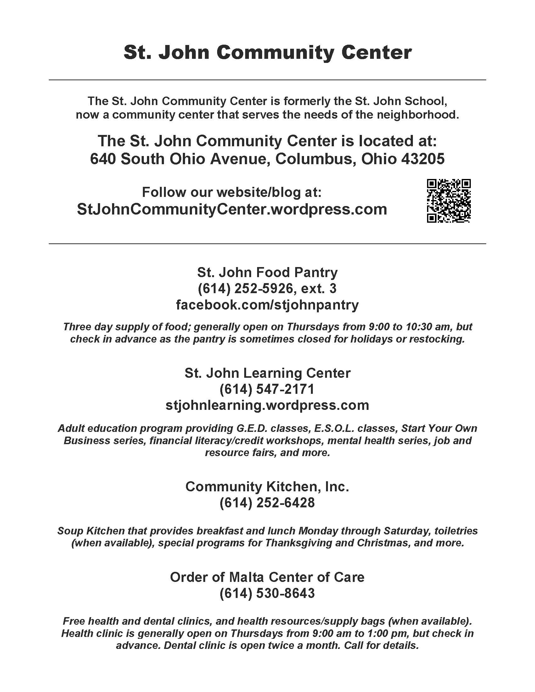 • St. John Food Pantry: Offers walk-through and drive-through pantry service once per week.